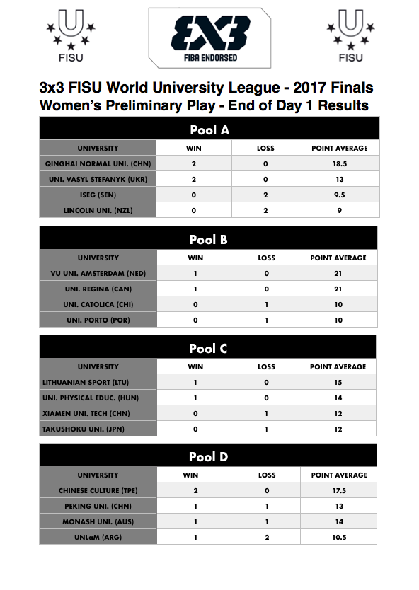 Women’s results after Day 1 of the 3×3 FISU World University League – 2017 Finals