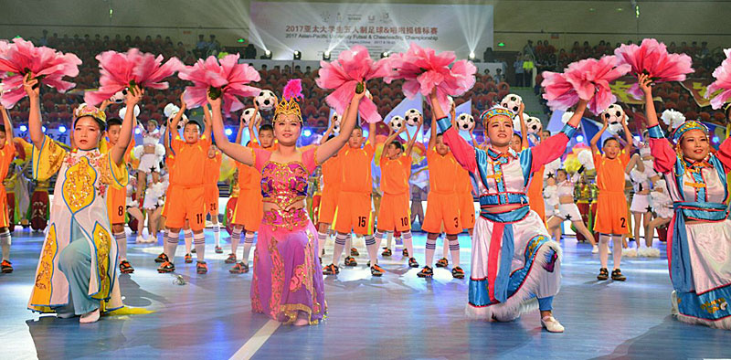 On behalf of the Organizing Committee, Mr. Ma Zizhong welcomed all friends from home and abroad. He said 2017 Asian-Pacific University Futsal & Cheerleading Championship is the first international championship hosted by Lingwu. It is also a historical moment of Lingwu sports development. The Organizing Committee promised to provide the best and most effective and considerate service to all delegations. Mr. Jargalsaikhan congratulated on the grand opening and expressed his appreciation to the Federation of University Sports of China (FUSC), Sports Bureau of Ningxia Hui Autonomous Region, Education Department of Ningxia Hui Autonomous Region and Lingwu Municipal Government for the wonderful organization, on behalf of AUSF. He pointed out that this championship was the first joint programme between AUSF and the Oceania University Sports Federation, which was an innovative act to combine futsal and cheerleading to make the competition more appealing. At last, he wished all teams performing the best and the Championship a great success!