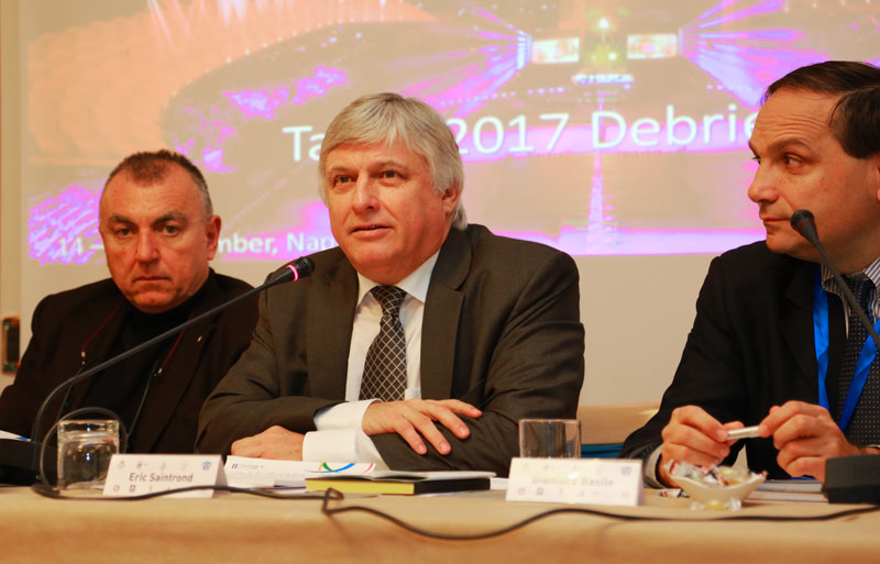 FISU Secretary General and CEO Eric Saintrond (centre) at a Wednesday debrief session, flanked between Napoli 2019 Director General Gianluca Basile (right) and CUSI President Lorenzo Lentini