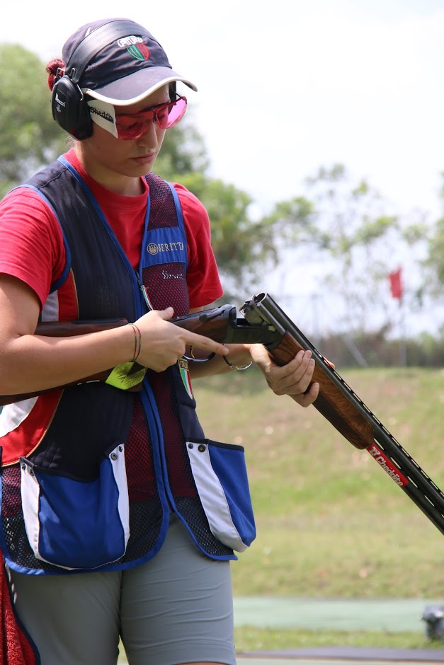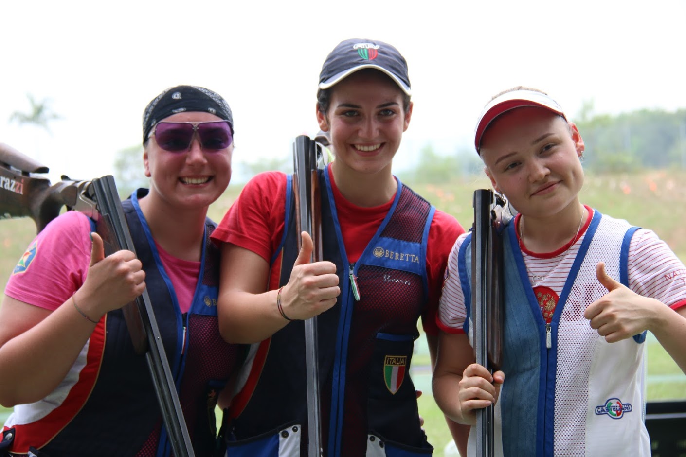 Italy’s Rossi Fiammatta poses with her “perfect 40” during the Women’s Trap Team event as the Italian trifecta top honours in the first 2018 WUC Shooting Sport event