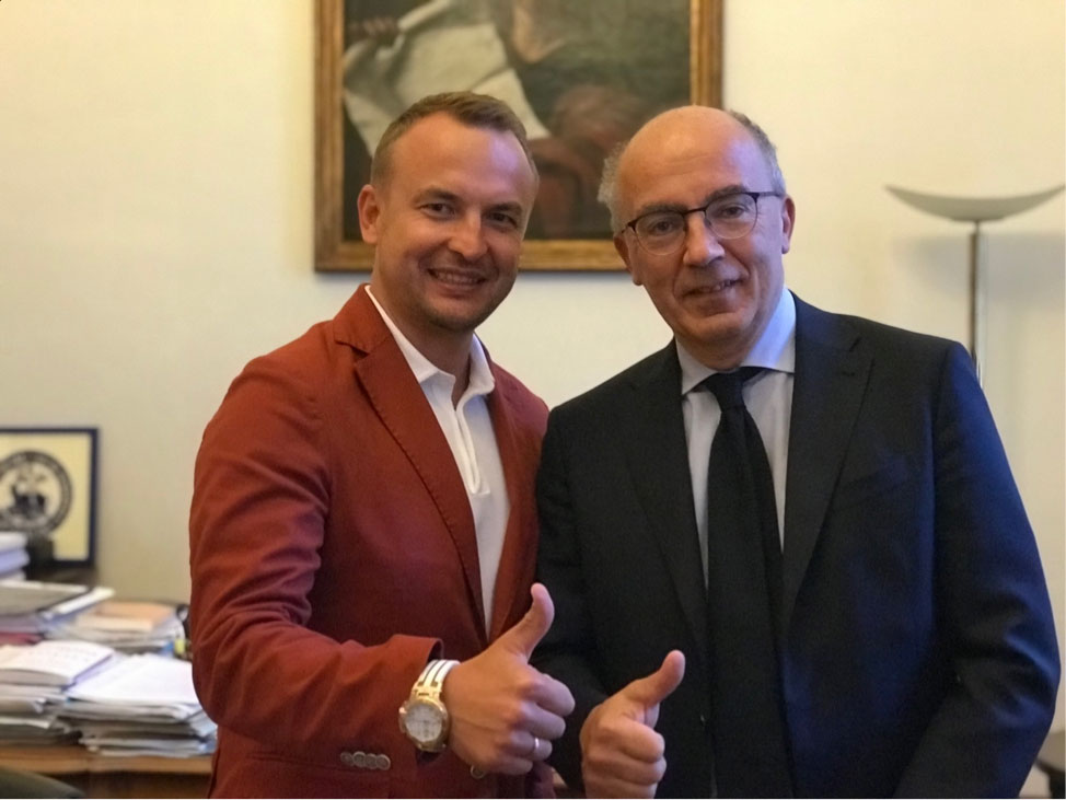 The Rector of the University of Turin, Gianmaria Ajani (right), and General Adviser to the FISU President, Igor Sivov, pose for the camera in Torino this May