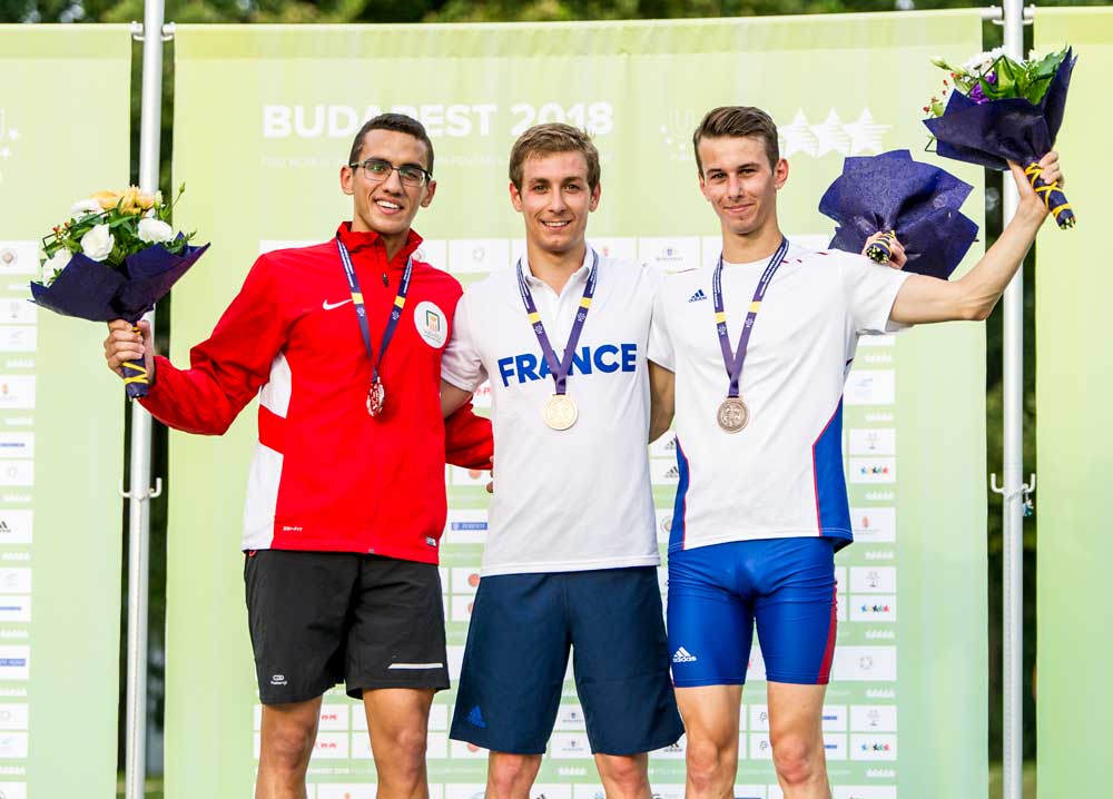 The Men’s Tetrathlon podium at the FISU World University Modern Pentathlon Championship: Gold, Brice Loubet (FRA, centre); Silver, Ahmed Elgendy (EGY, left); Lukas Svechota (CZE, right)