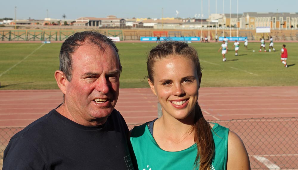 Sophie with her father Chris at the WUC Rugby Sevens competition in NamibiaSophie’s father Chris says he wasn’t surprised to see his daughter take up the male-dominated sport of rugby while rowing up, and admits to still being a little nervous when watching Sophie battle it out in the physically-demanding game.