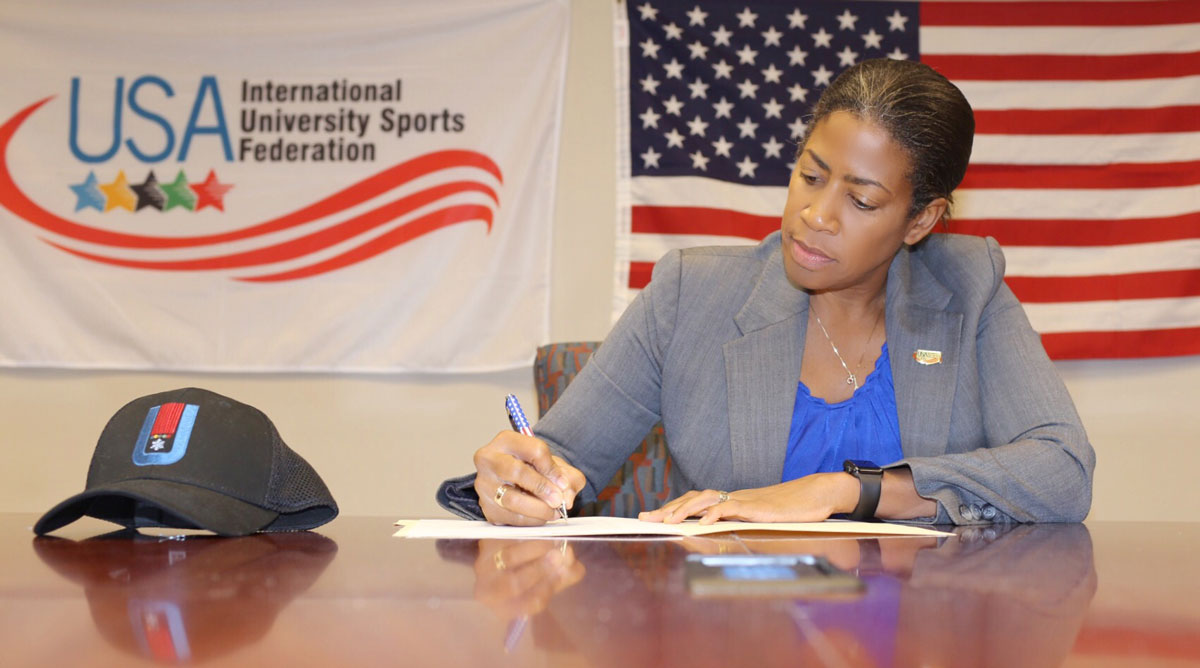 The Secretary General of the United States’ National University Sports Federation, Delise O’Meally, signing the host city contract this week in Lake Placid