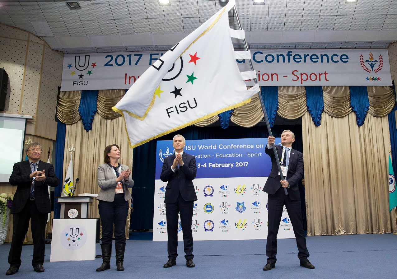 The FISU Flag flying high during the FISU Conference passover from Almaty organisers to Krasnoyarsk