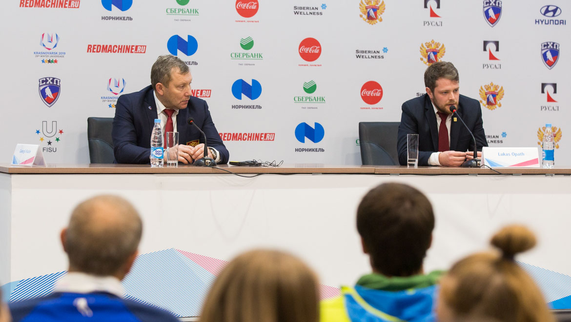 Anvar Valiakhmetov, the coach of SHL West team from Russia (left) and Lukas Opath, the coach of UMB team from Slovakia at the post game presser spoke of the high level of this event, and how they hoped to be back here for Winter Universiade 2019 in March