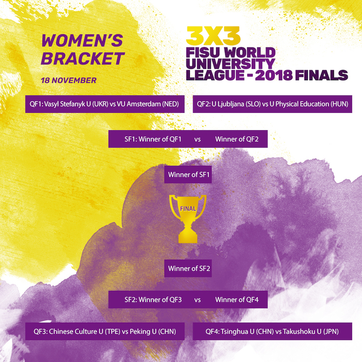 XIAMEN — The 3×3 FISU World University League 2018 Finals comes down to this — the day when one men’s and one women’s team will be earn the right to head back to campus as the world’s best 3×3 university crew.