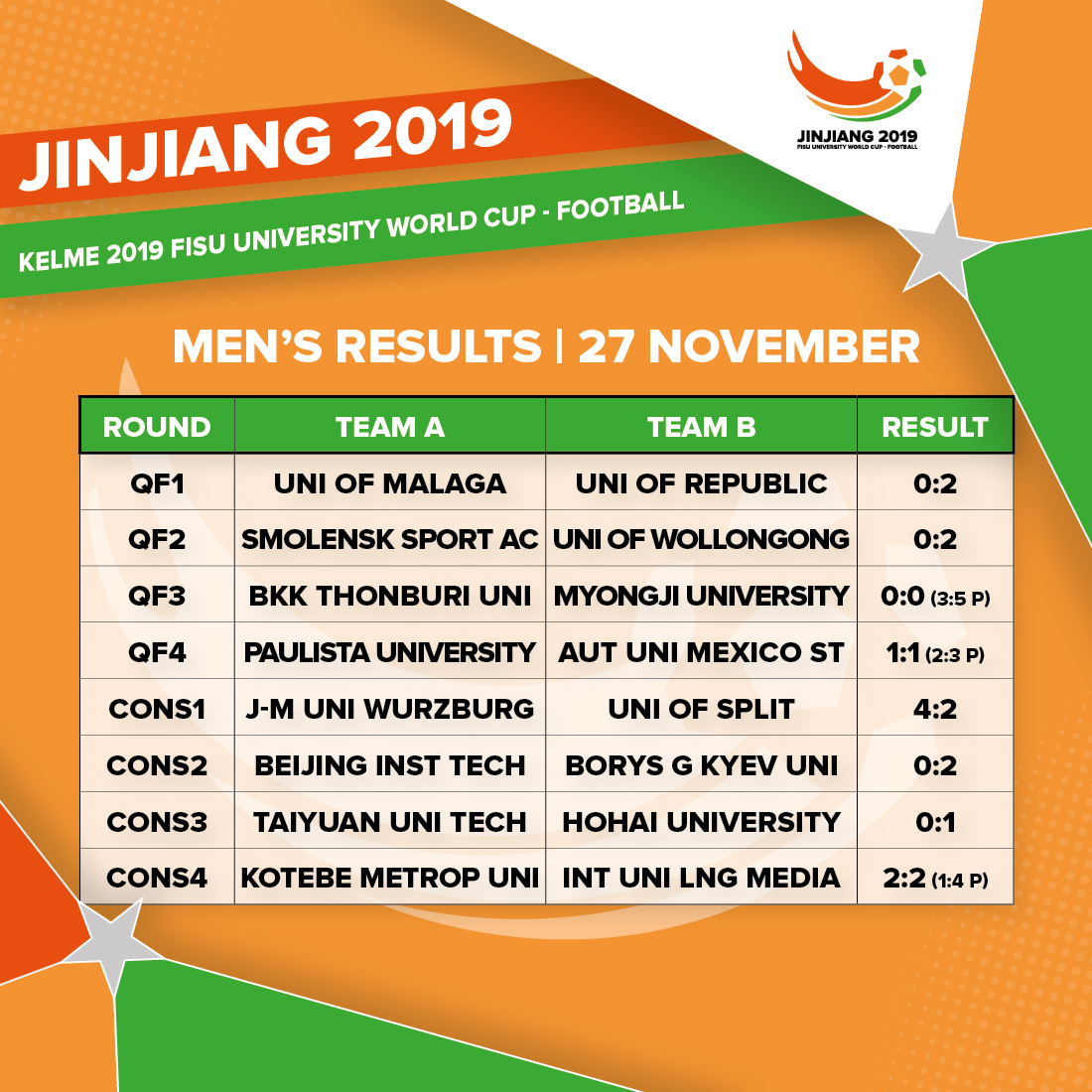 JINJIANG, People’s Republic of China – In quarterfinals that turned the pattern of the KELME 2019 FISU University World Cup – Football upside down, all the table toppers from the group stages were knocked out in the last eight by those that had finished second in their respective groups.