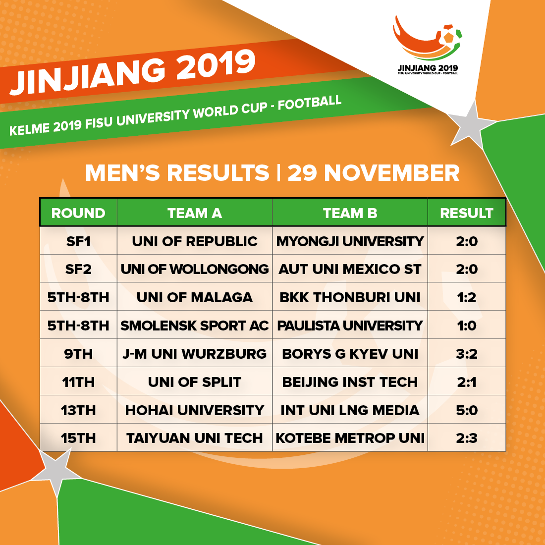 JINJIANG, People’s Republic of China – Perhaps considered dark horses at the start of the tournament, University of Wollongong from Australia fortified their bid to win the first ever University World Cup – Football with a clinical 2-0 victory over the Autonomous University of Mexico State.