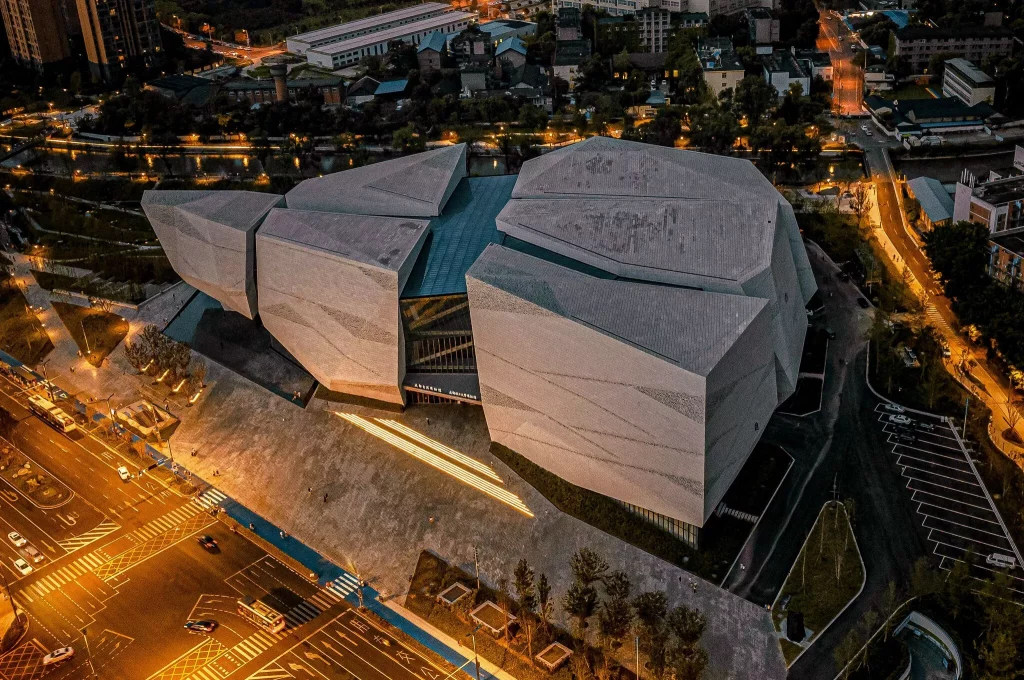 Once visitors have landed and are in the city, and when time permits away from all the great sporting events of the Chengdu 2021 FISU Games, they will want to go and check out the Chengdu Museum of Natural History. The designer, Pelli Clarke & Partners, wanted to bring into the building’s features some of the region’s landscape. The form of the building evokes the process of rock breaking, emblematic of the tectonic plates coming together and the volcanic activity that formed the nearby mountains. The sky bridges and passageways inside the museum mirror the traditional cliff trails found in the Chengdu region.