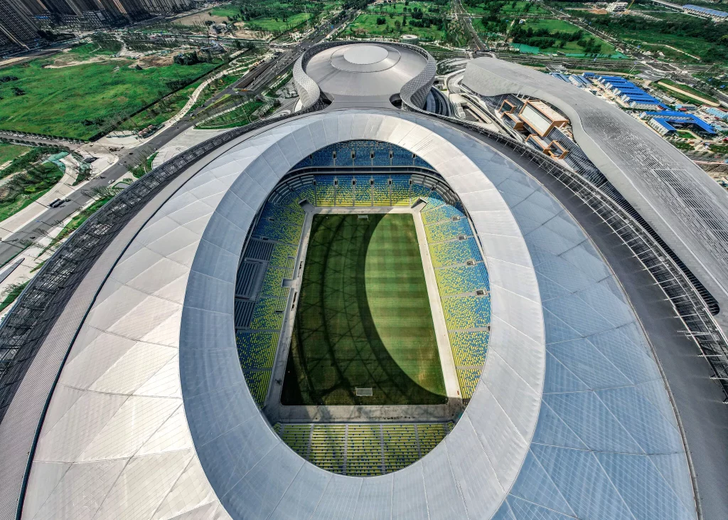 Designed by HKS, its inspiration is from a tea infusion set called Gaiwan that allows people to see the stadium as a bowl, the plaza surrounding it as the saucer, and the gymnasium as the lid that goes on top. This ties to the strong tea house culture that exists in Chengdu. The exterior of the venues is based on Shu Jin, or Sichuan Brocade, which originated in Chengdu, and the surface gives the impression of silk threads that attract and reflect light uniquely throughout the day.