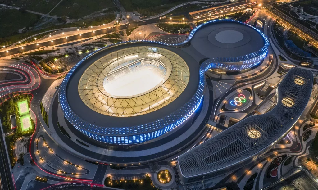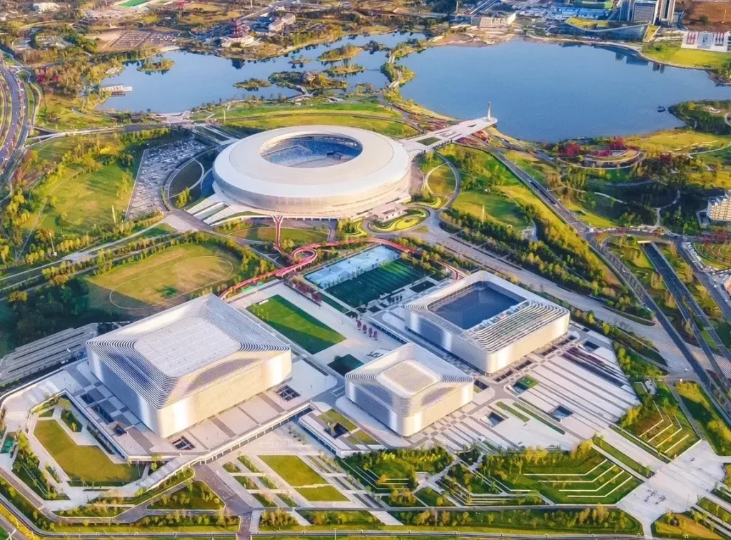 A prominent set of facilities to be used for the Chengdu 2021 FISU Games is the Dong’an Lake Sports Park. Located in Chengdu’s Longquan District and designed by gmp Architects (von Gerken, Marg, and Partners), this futuristic set of three cuboidal blocks will host swimming and artistic gymnastics. Outdoor green spaces connect the three venues which are also tied together by spiraling corridors that link them to the Dong’an Lake Sports Park Stadium, host to the opening ceremony on 28 July. The futuristic aluminum enveloping the venues helps set them as ‘artifacts in nature,’ as described the by the designer, while the nearby Torch Tower brings another standout element to the area.