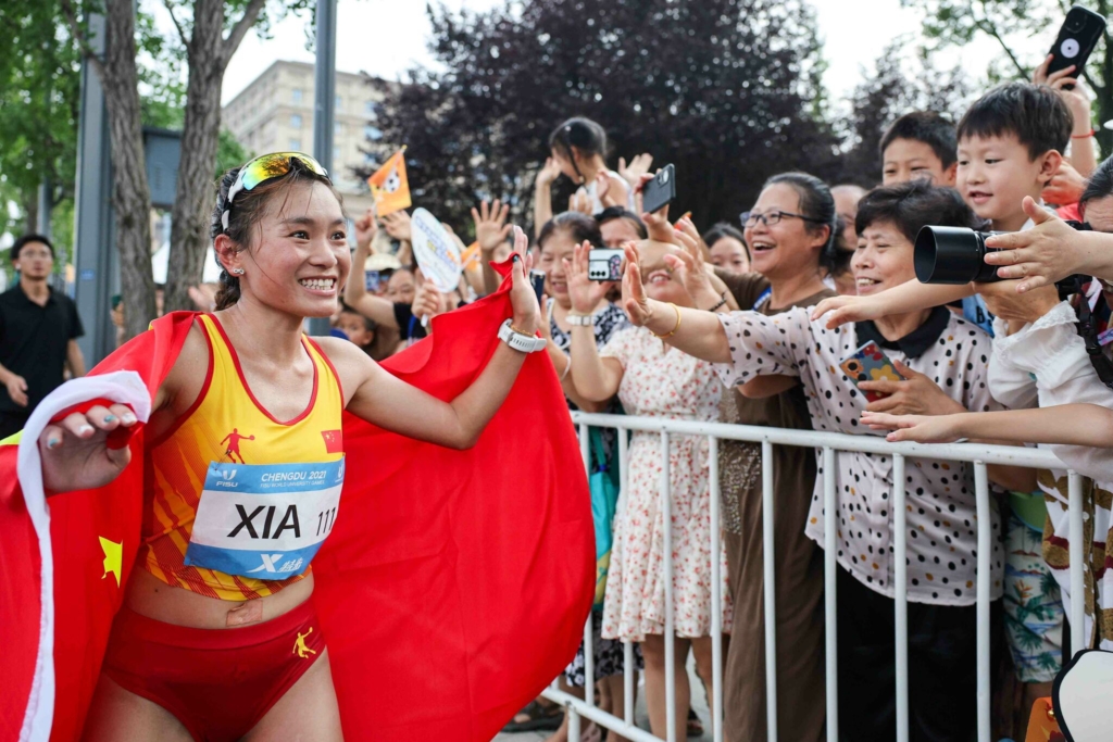 Xia waves to the crowd after winning bronze in the women’s team half-marathon“Actually, I never thought that I could get into Tsinghua University before going to Beijing because it’s the top university in China, and it’s very difficult to get into,” said Xia Yuyu, the Chengdu FISU World University Games women’s 10,000m gold medallist, silver medallist in the women’s 5,000m, and third place finisher in the women’s half-marathon team event.