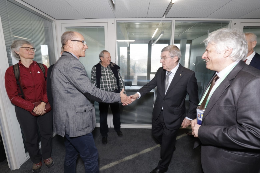 Leonz Eder and Eric Saintrond welcome IOC President Thomas Bach.