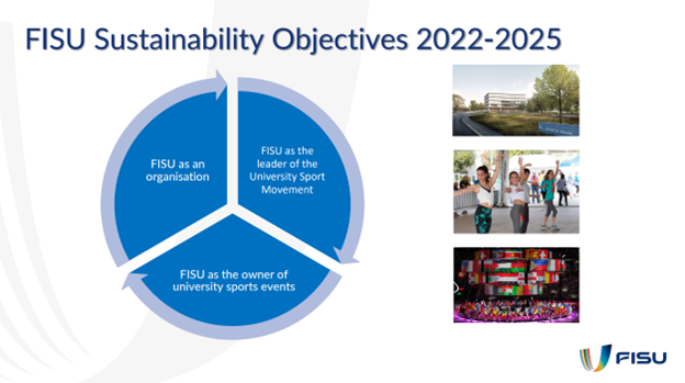 Sameer Janmohamed, Assistant to the Director General (FISU Sustainability), was the first presenter. He shared insights on the importance of sustainability and what it entails, FISU’s sustainability objectives for 2022-2025, and the status of sustainability within FISU. He also highlighted the negative impacts of unsustainability such as famine, poor health, displacement of people, and armed conflicts due to scarce resources. His presentation also outlined ways in which sport can contribute to sustainability and FISU’s initiatives in this area.