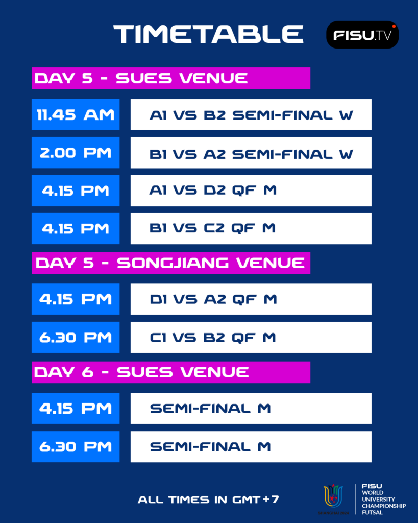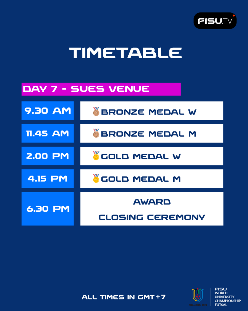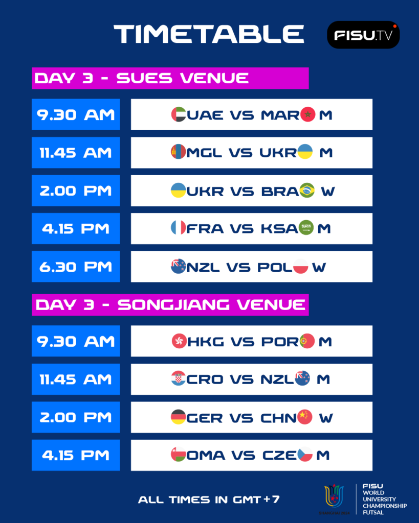 In Shanghai, there will be two days of intense group matches, then a break on Thursday 13 June with a cultural activity – a visit to the Guangfulin site – to make sure all student-athletes make the most of their trip to China and experience a lot more than just the futsal competition. The following two days will be dedicated to the semi-finals and ranking games, before the medal matches and the closing ceremony on Saturday 16 June.