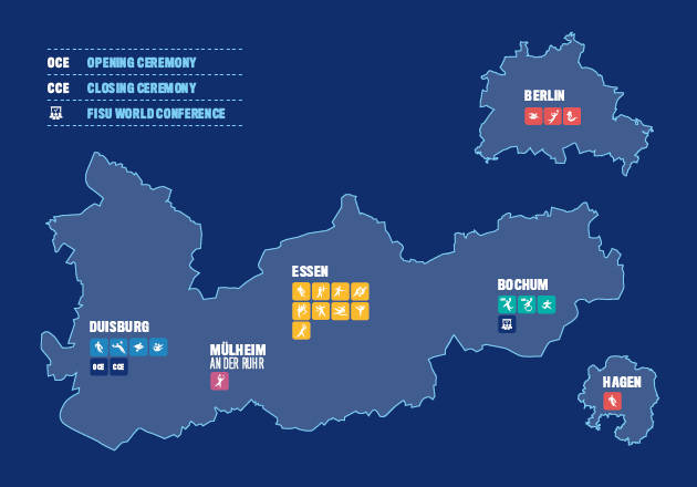 Berlin will complement the existing venues in Bochum, Duisburg, Essen, Mülheim an der Ruhr and Hagen. The sponsors – the State of North Rhine-Westphalia and the Federal Government – approved the final programme and financing concept a few weeks ago, with the additional support of German University Sports Association (adh) as organiser, and the International University Sports Federation (FISU). This means that around 8,500 athletes from around 150 countries can look forward to a varied programme of 18 sports in excellent venues.