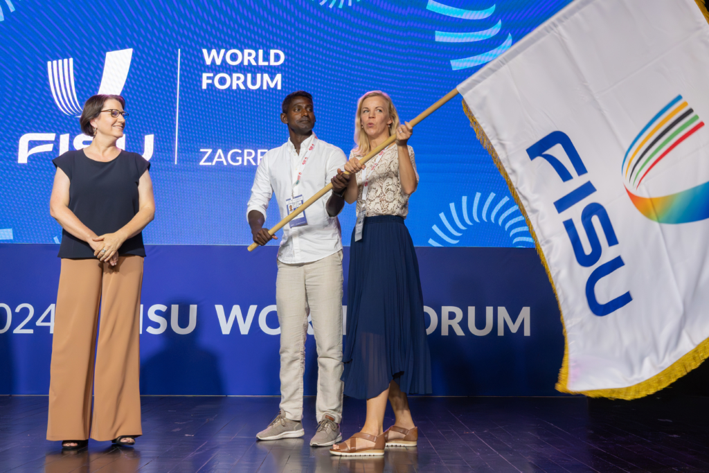 She then passed on the FISU flag from FISU Executive Committee Member and Zagreb 2024 FISU World Forum Organising Committee President, Marko Žunić, to Christopher Svensson, president of the Swedish NUSF and Rosi Hoffer, deputy mayor of the city of Östersund that will host the next FISU World Forum in 2026.