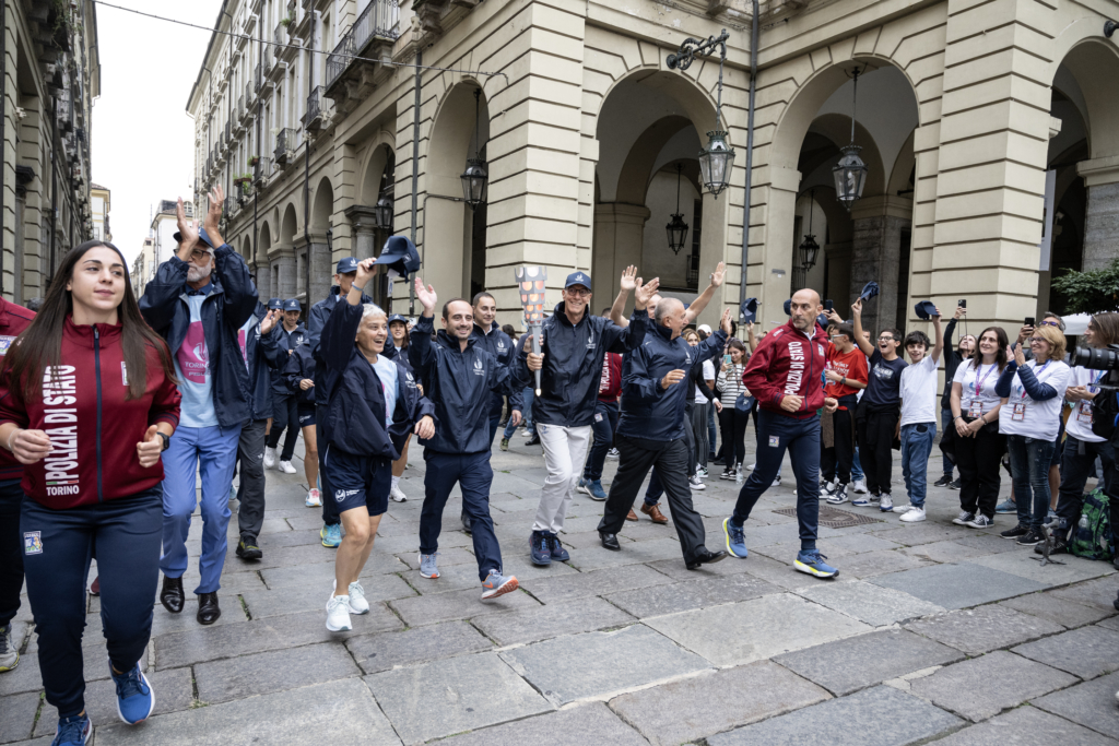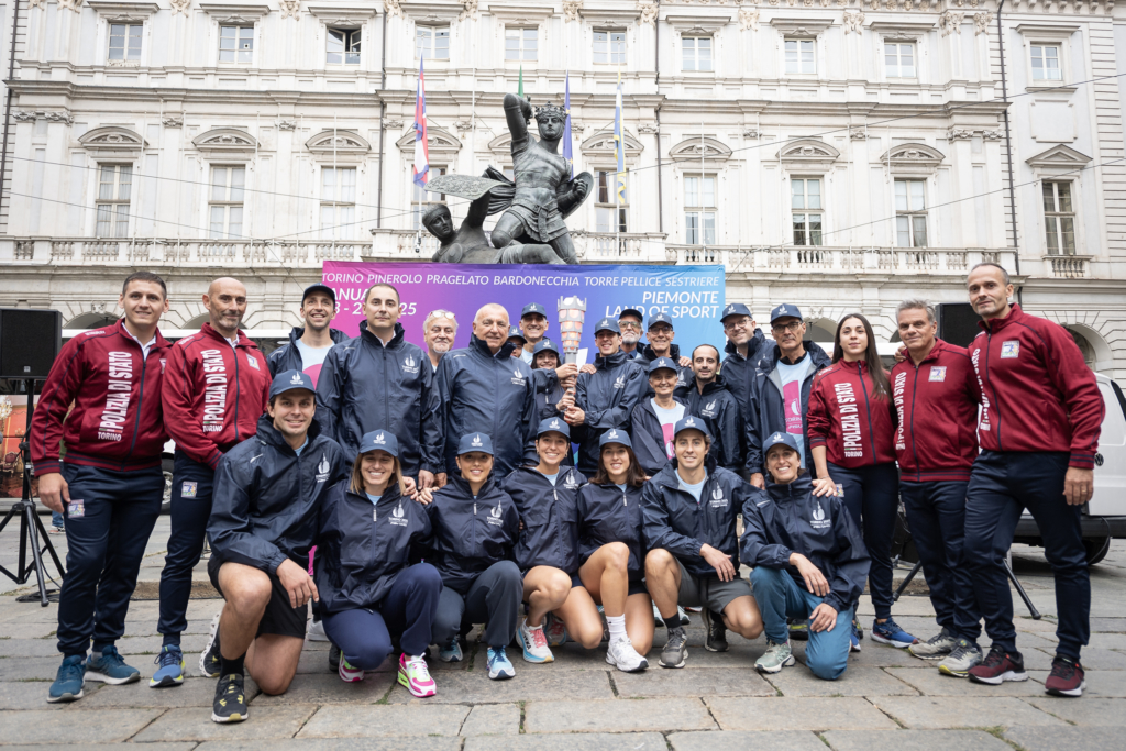 The official torch relay began straight away, carried from the University Rectorate through the city, where it was welcomed by a hundred students from schools in the region, fifty volunteers representing the entire volunteer corps and the heads of delegations from 23 of the countries that will be taking part among other nations in the FISU Games Turin 2025.