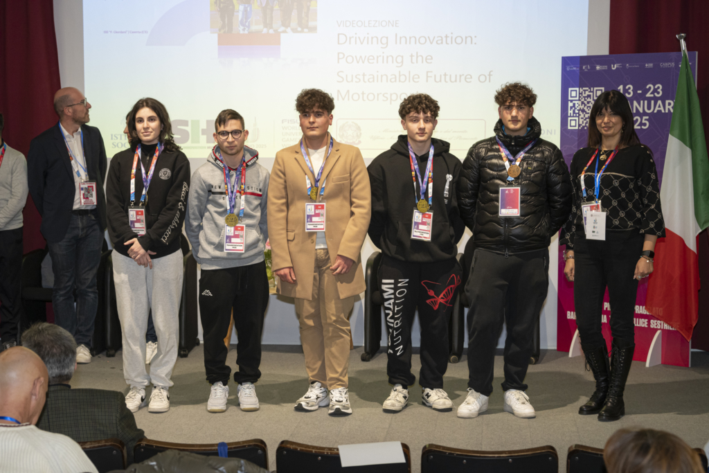 It was then time to welcome the national contest winners, who had just been enjoying sports practice during the day. The bronze medallists are team Sport Insieme from IIS Olivetti (Ivrea) with their project on inclusive volleyball. Second and silver medallists, Team 3 A DVN 1 from IIS Da Vinci Nitti (Cosenza) who presented women referees and finally the big winners came all the way from the South of Italy: team Imaginers from IIS F. Giordani (Caserta) with their video lesson called “Driving Innovation: Powering the Sustainable Future of Motorsports”