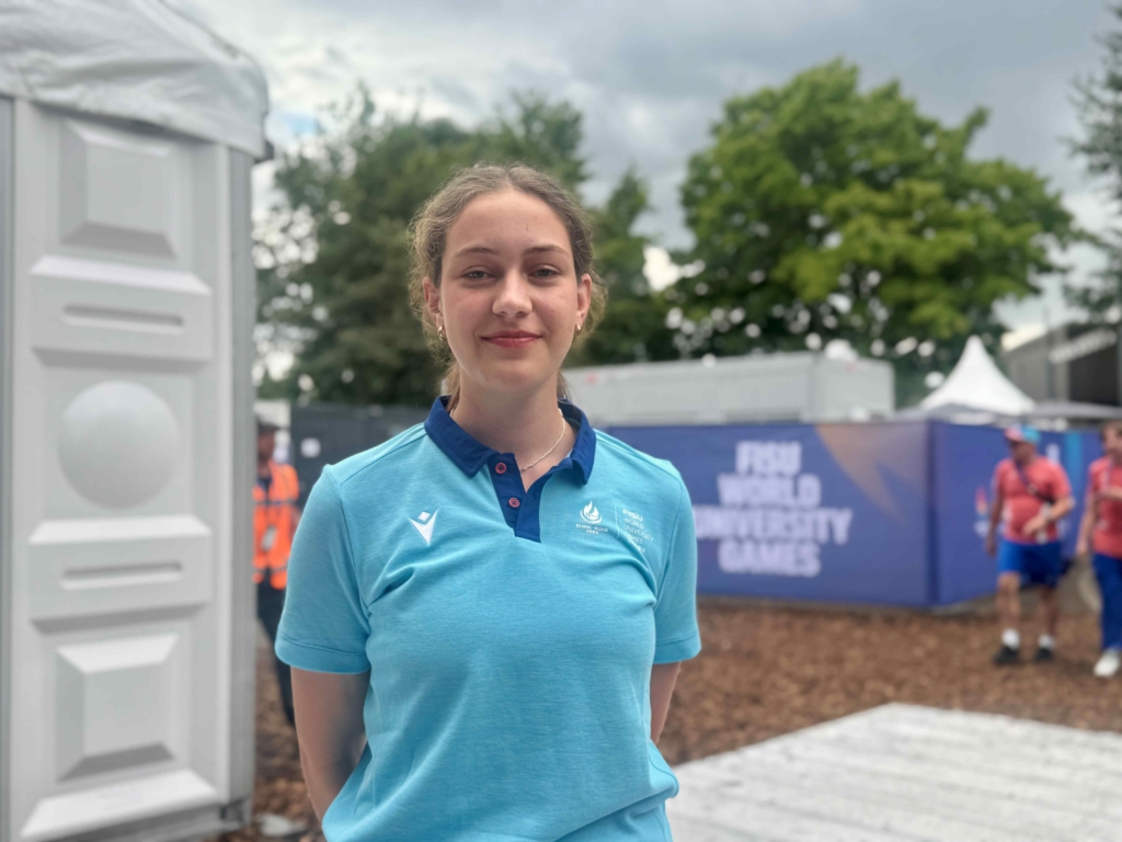 Emily Engler, a 22-year-old law student from Germany, sits behind the referee table, focused and composed. She first discovered beach volleyball online and started volunteering at the national “Drum Beach Tour”. Through experience and connections, she was invited to work at international events, including the Elite 16 Tour and now the FISU Games.
