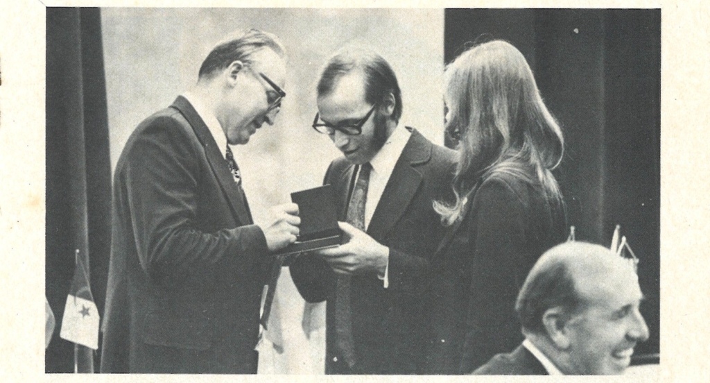 Erkki Tervo (centre), receiving a gift from Poland’s Dr. Jerzy Skorowsky during the FISU Conference in 1974 in Finland.