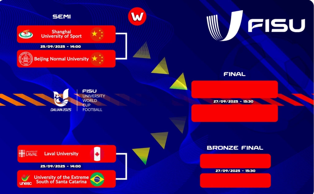 Next on the “menu”, women’s semi-finals on 25 September, with a Chinese derby between Shanghai University of Sport and Beijing Normal University on one side and a clash of FISU America between the Canadians from Laval University and the Brazilians from the University of the Extreme South Santa Catarina.