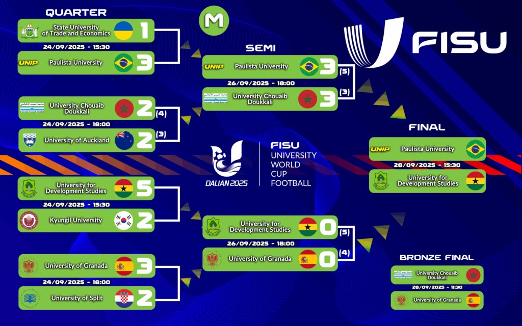 The two men’s semi-finals took place on Friday and were watched by over 3000 people around the world on FISU.tv. The scenarios of both University for Development Studies (GHA) against University of Granada (ESP) and Paulista University (BRA) against Chouaib Doukkali University (MAR) kept them logged on for a long time since both games finished with penalty shootouts.