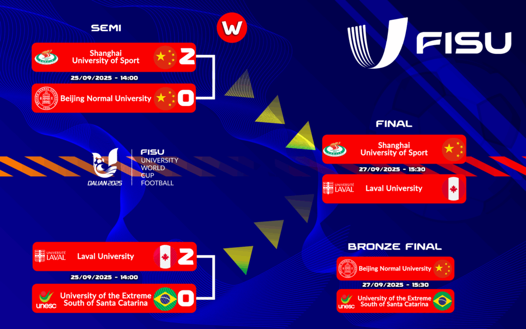 On Saturday, the university football world will have a new queens and new silver and bronze medallists. The final will oppose “locals” from Shanghai University of Sport to Canada’s Laval University. China qill have a chance to win a second medal, as Beijing Normal University will play The University of the Extreme South of Santa Caterina (BRA) for the bronze medal final.