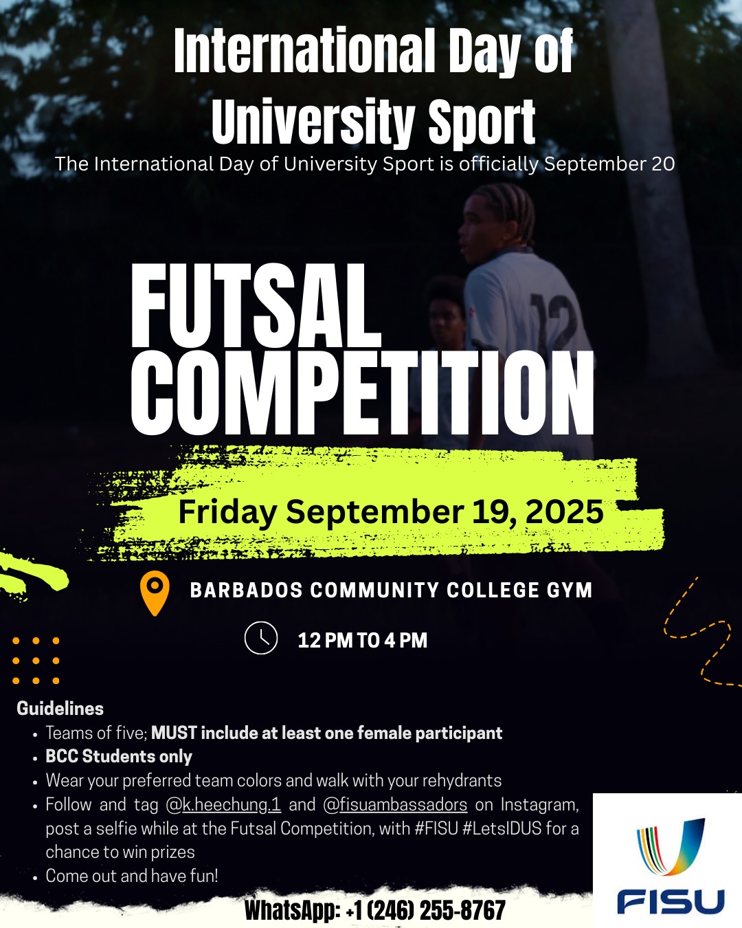 In Barbados, a futsal event was organised on the 19 September for the Barbados Community Colleges Students to celebrate IDUS. Five teams took part to the tournament and many people came to watch. K’den Hee Chung, FISU Student-Ambassador from Barbados the student ambassador for Barbados designed the flyer of the event.