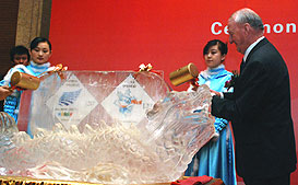 After the speeches, Mr. Killian was invited the crack a giant ice block with a hammer to make appear an enlarged copy of the stamp. After the ceremony Mr. Killian was invited to sign the first issue cards with his name. No need to say a lot of Chinese collectors flocked around him to get this treasured collector’s item.
