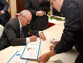 Mr. Killian signing first day sheetsp the give more the impression of movement’, Ms Shang said. ‘We used a special printing technique to give a light effect in the snow flowers. It was quite a challenge for us as this stamp represents a big sporting event for China.’