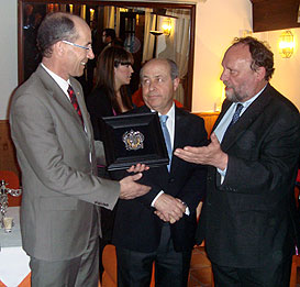 Leonz Eder, Chairman of the FISU Evaluation commission, receives a gift from the Rector of the University of Malaga, Mr Francisco Gonzalez Lodeiro. In the middle the Mayor of Granda, Mr Jose Torres Hurtado