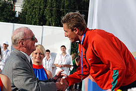 FISU President Killian congratulates Jason Dunford (KEN) with his silver medal on the 50m butterfly
