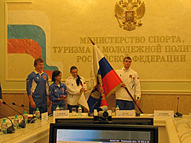 The seeing off ceremony ended with a transfer of the Russian student national team’s flag from Erzurum 2011 champions in figure skating Nodari Maisuradze and Lyubov Ilyushechkina to the Shenzhen 2011 delegates. The flag was handed over to Evgenia Polyakova, the Beijing 2008 Olympic champion, and world-class master of sport in athletics Pavel Karavaev.