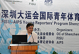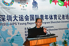 SHENZHEN – Today, August 12th, the Young Reporters’ Seminar kicked off with the first morning session. After Program Director Alan Abrahamson coached the participants how to speak in front of the camera by letting them introduce themselves, the morning session was an introduction on FISU. Chair of the International Press Committee Leonz Eder introduced the other FISU Speakers, i.e. IPC Vice-Chair Verena Burk, Press Officer Christian Pierre and Universiade Assistant Jing Zhao.