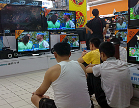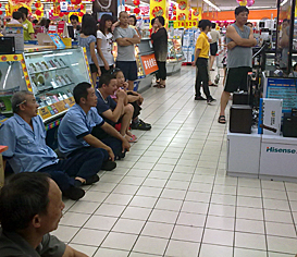 On August 18th, during the Female Football match betweenChina andBrazil a bunch of local people interrupted their shopping in the supermarket and started watching the game. Suddenly, the electronics department of the supermarket was full of “aaahhhs”,“ooohhhs”, “jia yous” and “ahh yaas” .
