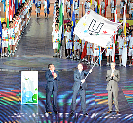 Notwithstanding the different format of the closing, the FISU protocol was respected. The Universiade flame was extinguished and Shenzhen Mayor Xu Qin returned the FISU flag to FISU President Gallien who handed it over to Ilsur Metshin, the Mayor of Kazan, the host city of the 27th Summer Universiade in 2013. Mayor Metshin then handed the FISU flag over to the 1st Deputy Prime Minister of the Russian Federation, Mr. Igor Shuvalov, who passed the flag to Oleg Matytsin, FISU 1st Vice-President and President of the Russian University Sport Federation. In his speech Mr. Shuvalov congratulated the Shenzhen organizers for the successful Games and welcomed the FISU Family toKazan.