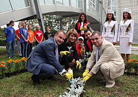 After a solemn welcome, the Kazan 2013 delegates andPermstudents headed to Perm State National Research University. Igor Makarikhin, Rector of one of the largest and oldest universities of the Ural, extended a warm welcome to the guests from Tatarstan near the entrance to the main building of the university, where the Flowers of the Universiade event took place. The first flowers were planted by Igor Makarikhin, Larisa Sulima, Igor Sivov, Timur Suleimanov, Alsu Valeeva and Kazan 2013 Ambassador Dilyara Vagapova.