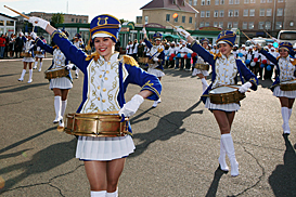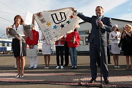 The best creative bands of Orenburg delivered a concert on the occasion of the FISU Flag Relay festivities; the Zhemchuzhinka band of drummers, a winner of the UNI-elite project, made an appearance in the gig as well. Following the concert staged on an improvised stage set up at the railway station, Director General of the Kazan 2013 Executive Directorate Igor Sivov made a presentation of the FISU Flag to young people of Orenburg. «The Flag that we delivered inOrenburgtoday is a unique relic that has seen many countries and has travelled thousands of kilometers. On August 23rd, we received the flag from our Chinese colleagues. It’s 40 years since it was in Russia for the last time. And today we are happy to deliver it in your city!» Igor Sivov said.