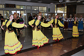 At the railway station inUfa, the Tatarstan delegation received a warm welcome extended by Ruslan Bikimbetov, Deputy Minister of Youth Policy and Sports of the Republic of Bashkiria, and youth of Tatarstan. The guests were presented a dance that combined national traditions of Bashkir, Tatar and Russian peoples.