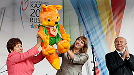 After Larisa Sulima, Chief of Staff of the Kazan 2013 Executive Directorate, handed the FISU Flag replica to the Mordovian President, a red fox, the symbol of the Republic of Mordovia, was presented to her in return.