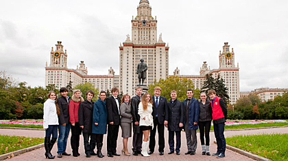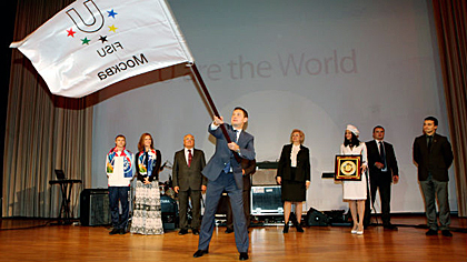 After extending his warm welcome to the guests, MSU Rector Victor Sadovnichy mentioned that «university sport is closely associated with beauty, strength and youth energy; it embodies the standard of achievements. The FISU Flag Relay implemented by the host city of the Summer Universiade represents an amazing initiative thanks to which a new impetus will be given to university sports development in Russia. As of today over 2,000 students of Moscow State University are doing professional sports, our hall of fame boasts numerous victories earned by students and graduates of Moscow State University. Today one of our most celebrated alumni, triple Olympic champion in synchronized swimming Maria Kiseleva is appointed a Kazan 2013 Ambassador.»
