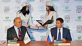 The agreement signing ceremony observed the attendance of Natalia Parshikova, State Secretary and Deputy Minister of Sports, Tourism and Youth Policy of the Russian Federation; Vladimir Taimazov, 1st Vice President of the Russian Student Sports Union and member of the Physical Culture and Sports Council under the President of Russia; Boris Mendelevich, Head of the Department of Health, Sports and Healthy Lifestyle of the Cabinet of Ministers of the Republic of Tatarstan; Andrey Kondratyev, Deputy Minister of Youth, Sports and Tourism of the Republic of Tatarstan; Vladimir Ziskind, Advisor to the Chairman of the Moscow Bank of Sberbank of Russia, and delegates of the FISU Flag Relay.
