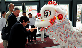 Mr. Igarashi interacted with the dragon dancing performers when arrived in the Taipei Arena