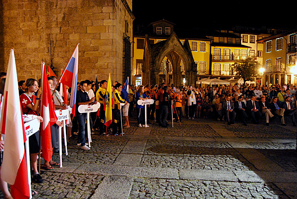 GUIMARAES – Largo da Oliveira in Guimarães hosted the opening ceremony of the 12th World University Chess Championship. As a protocol procedure, the Portuguese national flag came up on stage accompanied with the national anthem.