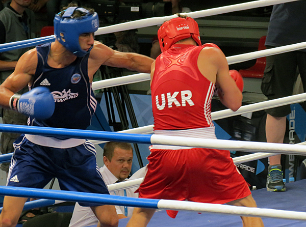 Radzhad Butaev (left) received loud cheers from the Russian home crowd during his bout with Denys Berinchyk, which he won by decision