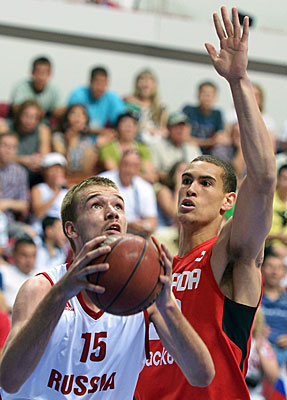 Dwight Powell blocking a shot from a Russian opponent at the 2013 Kazan Universiade