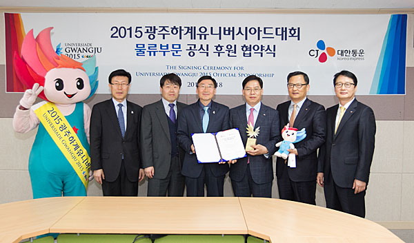 Representatives from the Gwangju 2015 Universiade Organizing Committee and CJ Korea Express sign a partnership agreement on March 18