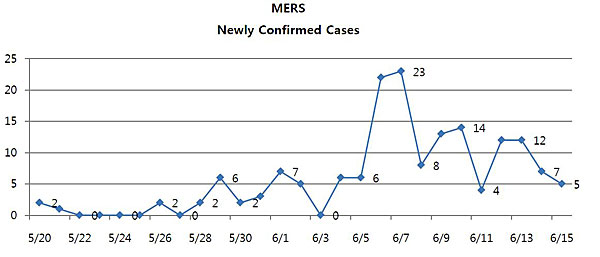 The figure shows the development of newly confirmed cases after the first patient was identified. After June 7, the number of confirmed cases has been falling from 23 to 5.